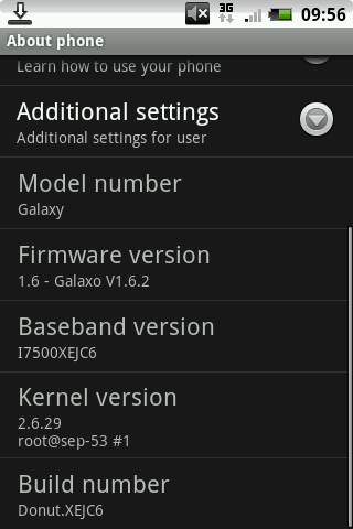 1.11 Perform a wipe as instructed in 1.10 and you’re all done! In Settings->About phone you should now see that Firmware version says something like Galaxy 1.6 and Baseband version says I7500XEJC6. The picture below shows that screen after Galaxo installation.